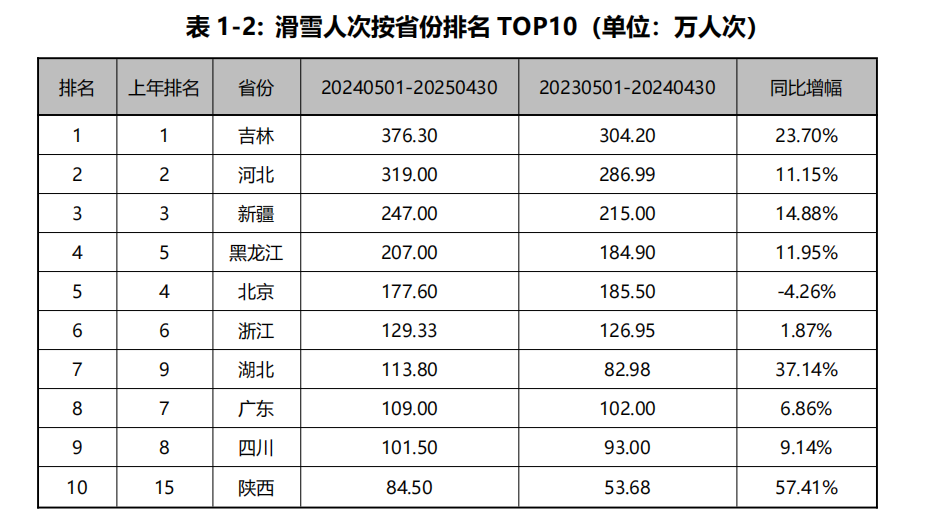 按省份分布,吉林、河北、新疆在全国滑雪人次分布中蝉联前三甲,其中吉林省以376.3万滑雪人次遥遥领先全国。