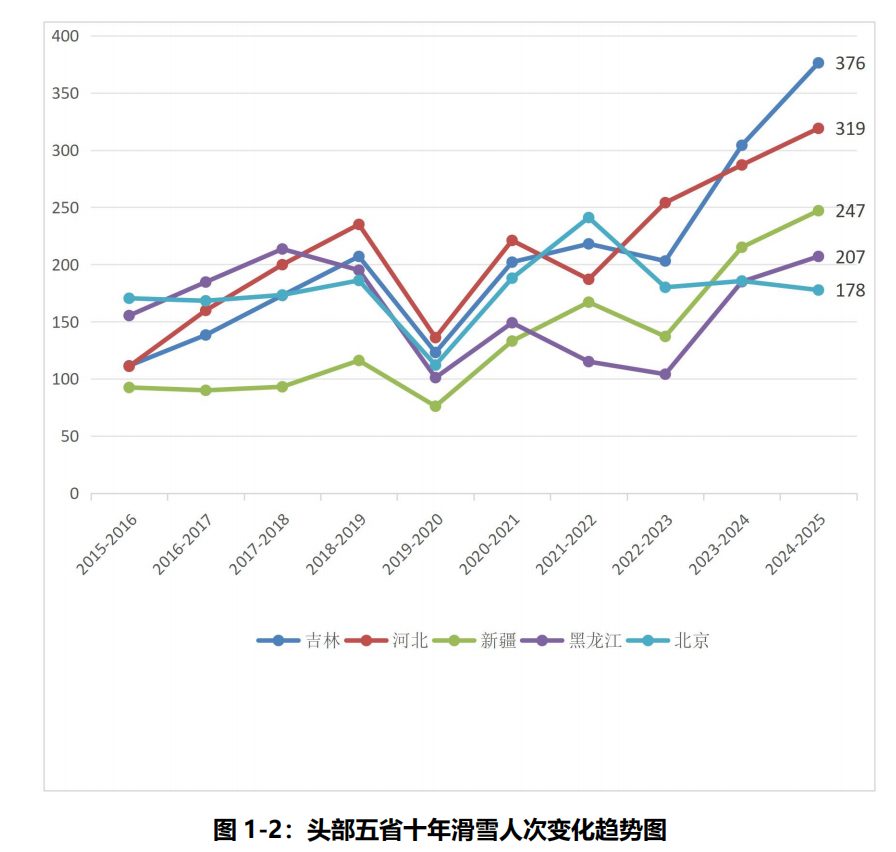 从连续十年的数据来看,吉林、河北、新疆、黑龙江、北京已形成中国滑雪目的地的头部五省格局,华北、东北两大区的滑雪人次占比均超过25%,合计连续两年超过全国总量的一半。