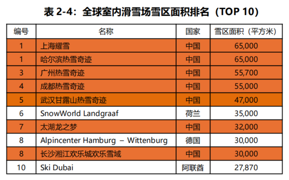 在国际对比中,中国已成为室内滑雪场的绝对领跑者。全球雪区面积排名前十的室内滑雪场中,中国占据七席,且前五名全部位于国内,其中上海耀雪、哈尔滨热雪奇迹面积最大,超过6万m²。随着深圳、长春等新项目的投入运营,中国在室内滑雪场全球前十中的占比预计将达到九席。