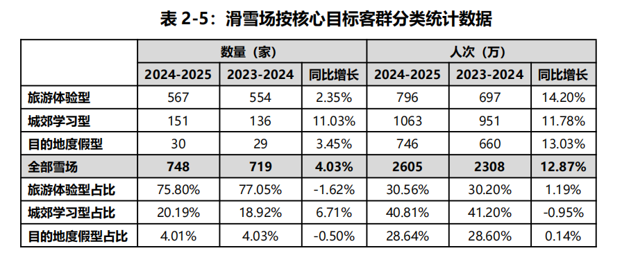 具体来看,旅游体验型雪场数量占比最大,达到75.8%,成为覆盖最广、最普及的雪场类型。城郊学习型雪场虽然数量仅占20.19%,但增速最快,累计服务滑雪人次最多,达到1063万,在培养初级滑雪用户和普及滑雪运动方面发挥着重要作用。符合目的地度假型特征的雪场共有30家,比上年增加1家,但滑雪人次增长了13.03%,共创造746万滑雪人次,占全国总人次的28.64%。虽然数量仅占4%,但贡献了近三分之一的滑雪人次,其中吉林“三万一湖”滑雪度假区、新疆阿勒泰三大雪场以及河北崇礼集群,已成为国内度假型雪场的典型代表。据新华社报道,去年进入11月后,可可托海国际雪场日均游客量超过2000人,其中90%的游客来自外省,显示出目的地度假型雪场在吸引深度滑雪消费群体和带动消费方面具有极强的拉动力。