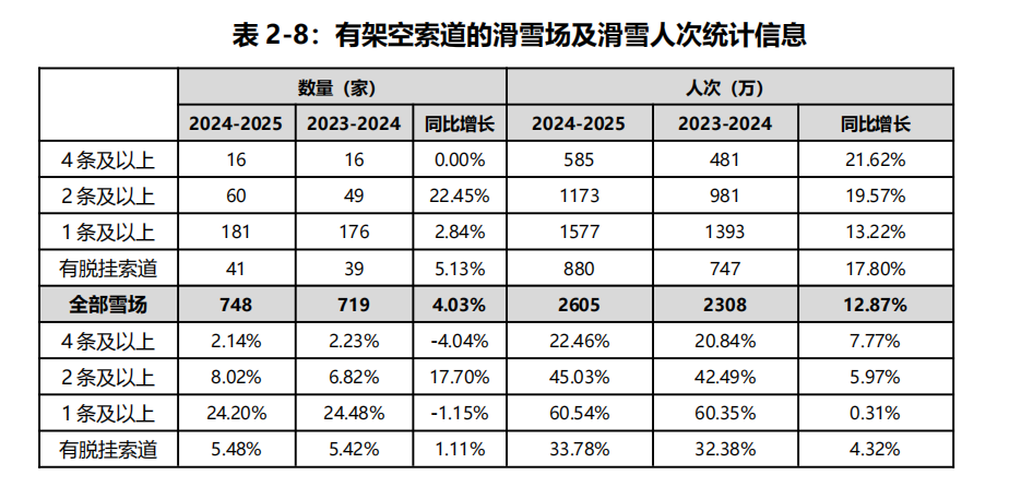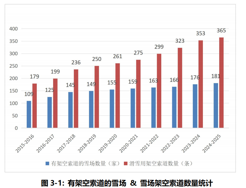 从数据来看,2024-2025雪季财年,全国新增12条滑雪架空索道,使得投入运营的架空索道总数达到365条,分布在181家雪场之中;同期新增魔毯170条,有效补充了初学者和儿童滑雪需求。值得注意的是,国内脱挂式索道发展加快,国产索道数量已达67条,已远远超过进口索道数量。