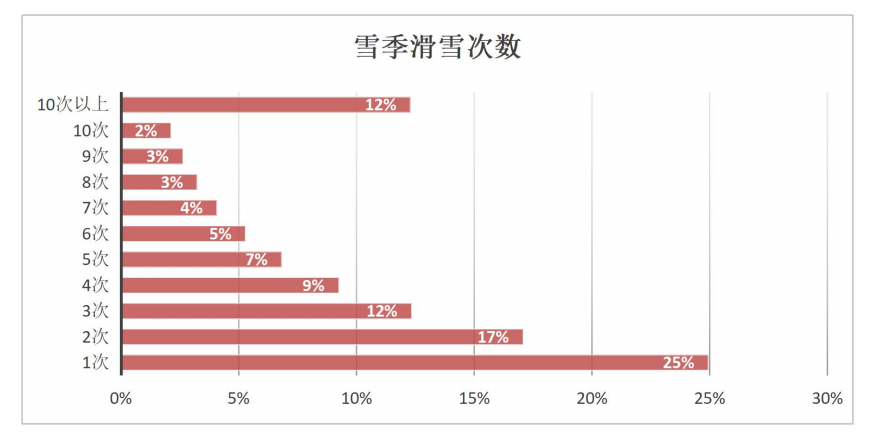 根据滑呗数据,在雪季滑雪次数上,低频用户仍占据主体,25%的用户每季只滑一次,17%的用户滑两次,合计超过四成,显示出滑雪对大量消费者而言仍是一种体验型消费。而每季滑3–5次的群体占比约28%,构成了从初学向进阶过渡的中坚层。核心用户虽然数量有限,但依然具备市场支撑力,约30%的滑雪者每季滑雪超过6次,其中12%的用户超过10次,体现出稳定的消费黏性。